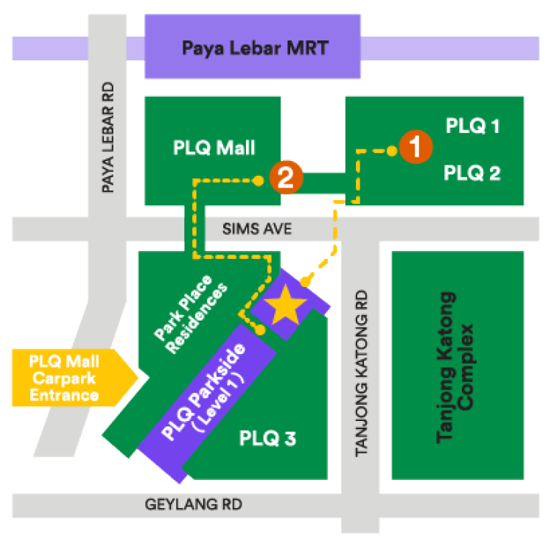 From Level 1 - Walk towards Wine Connection (01-07) at PLQ 2 and cross the road to Sims Ave